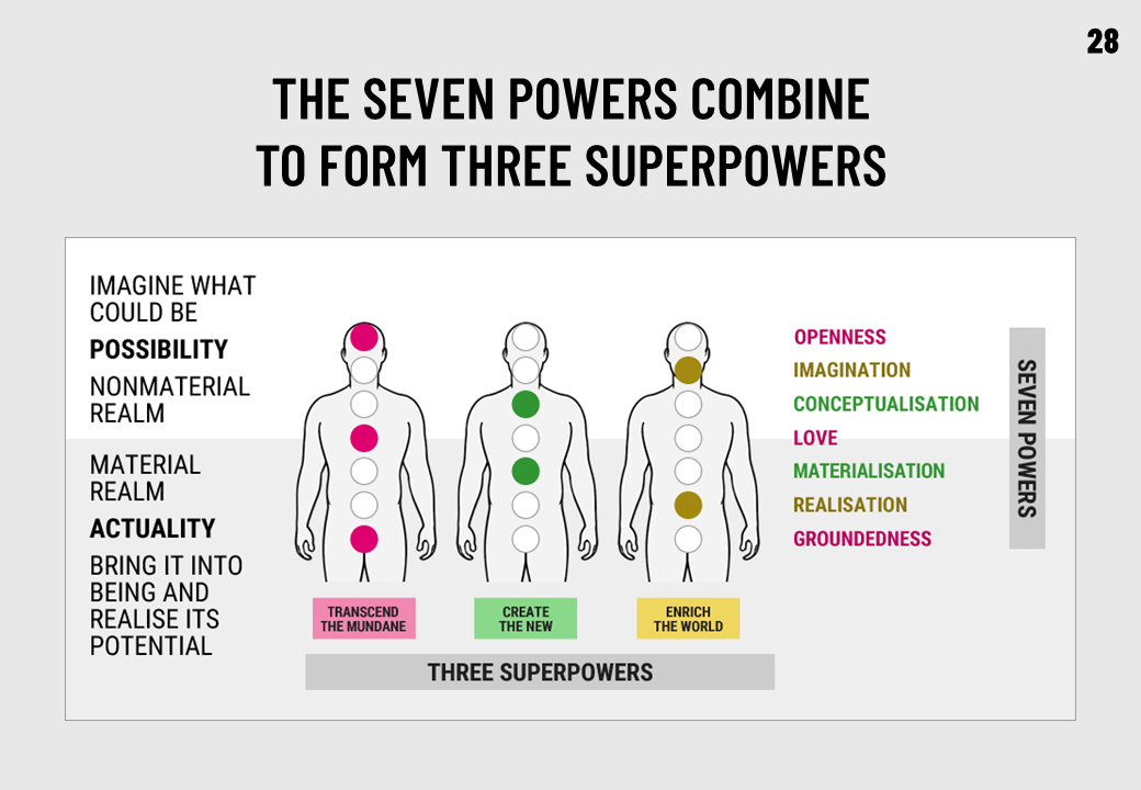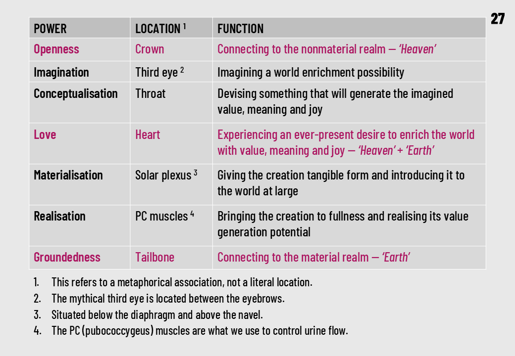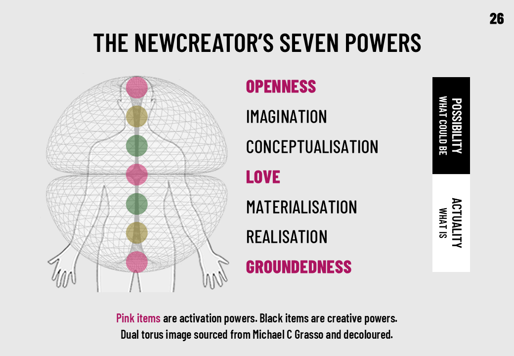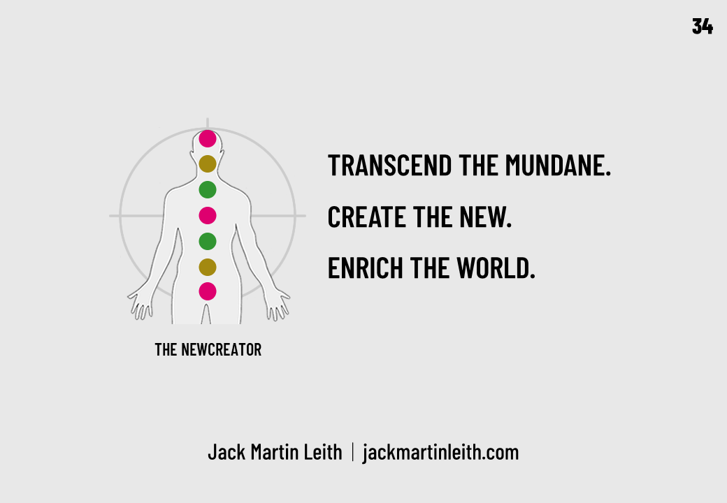 My chosen word for someone who pursues these ends, not on an ad hoc basis but as a way of life, is newcreator.Newcreators do their newcreating by using both brain hemispheres equally and by deploying seven powers, each associated with a specific part of the body. The newcreator is creative power in action.